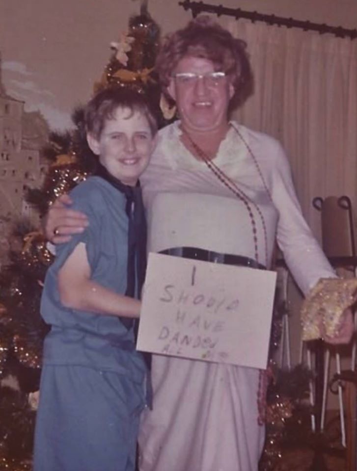 Often, the highlight of the evening turned out to be your appearance from the upstairs changing area. Invariably you’d come down as a woman, possibly decked out in one of Mom’s kaftan nightgowns, sporting rouge and a curly, auburn women’s wig that we had in storage. Perhaps you’d be a nervous beauty pageant contestant. One time you stuffed a cushion in the gown and pinned a sign on your distended, pregnant-looking belly that put a new lyrical twist to an old song, “I should have danced all night.”